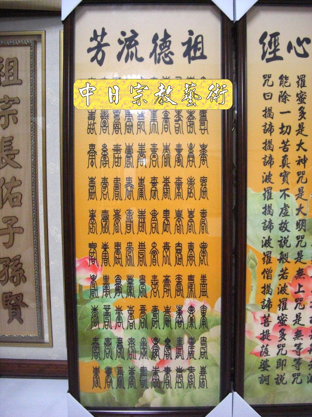C1901綢布蓮花心經+百壽(神桌佛桌供桌廟桌神明櫥佛櫥神像佛像佛祖聯佛聯神明彩聯對佛(像)掛公媽聯祖先聯公媽牌祖先牌位)